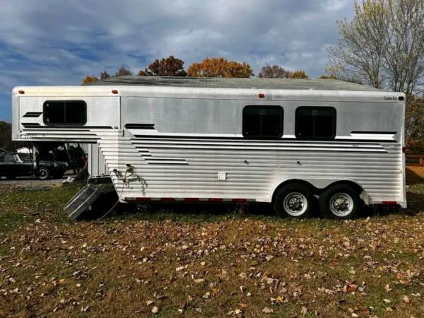 The doors in the back are 60/40, so the horses have a little more room on either side of them to load. Back tack with 3 saddle racks and bridle racks. There’s a spot behind the saddle racks for a water tank, also. There is a broken tie ring on it.